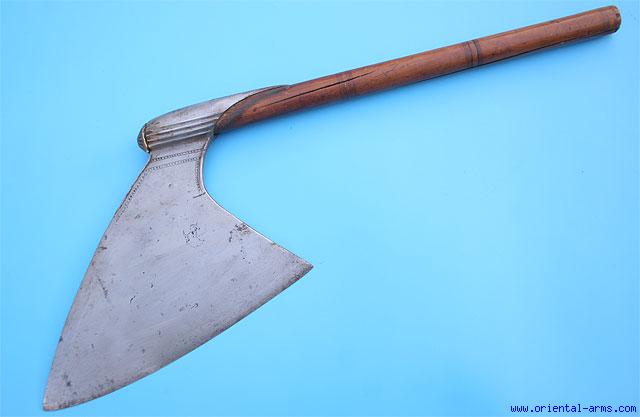 This is a very early type of a short battle axe from Central India which was used by the aboriginal Indian people from as early as the 16 C and up to the 19 C. The broad, 10 X 7 inches blade is mounted through its socket on a short wooden haft, 17 inches long. Very good condition. Very rare version of the big variety of Indian battle axes. |