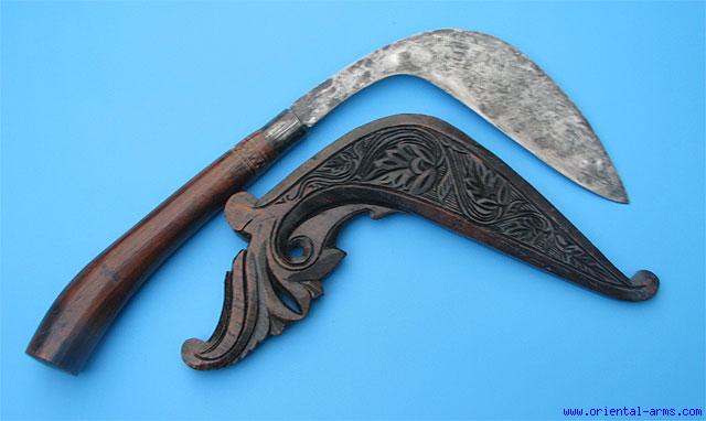 Either this is a sickle or a knife for agricultural use or for self-defense we do not know, but this beautiful blade is coming from Sumatra. 8 inches blade mounted onto an engraved hardwood handle with a steel collar. It is carried in a beautifully carved hardwood scabbard. Total length 15 inches. Very good condition. Very unusual and interesting piece.