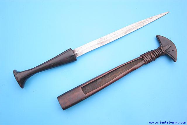 This fine dagger is from the Ambo People (also known as Ovambo) from Angola and Namibia. The finely forged blade of flat diamond cross section is 10 inches long. The handle and the scabbard are hardwood of very dark color and fine age patina. The scabbard is carved from a solid piece of wood partially opened in the front to reveal the blade. Total length 13 inches. Very good condition. Old crack at the bottom of the scabbard is reinforced with a bound rattan strip. |