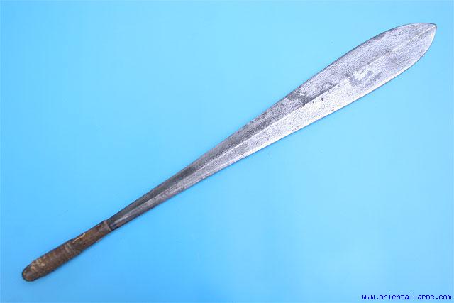Seme, The classical sword of the Massai people of East Africa. 20 inches long, well forged blade widening to 2 1/2 inches toward the tip in a spear point shape, and with a strong central rib. Hide covered handle .Total length 25 inches. Very good condition. Blackened areas on the blade with very minor pitted spots. Losses to the grip’s hide cover. This is the real authentic Massai sword, not one of the many traps sold to the tourist visiting Kenya and the neighboring countries.