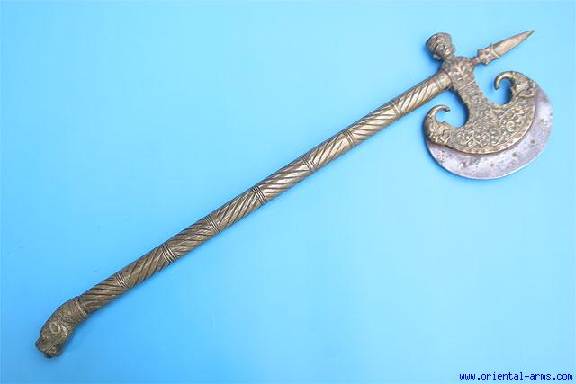 This axe is Indian, late 19 C., most probably for ceremonial purposes. Steel blade with brass stars inserts, set in a very decorative brass frame and mounted on a brass haft with a tiger shaped tip. Blade 5 inches, total 20 inches. Very good condition.