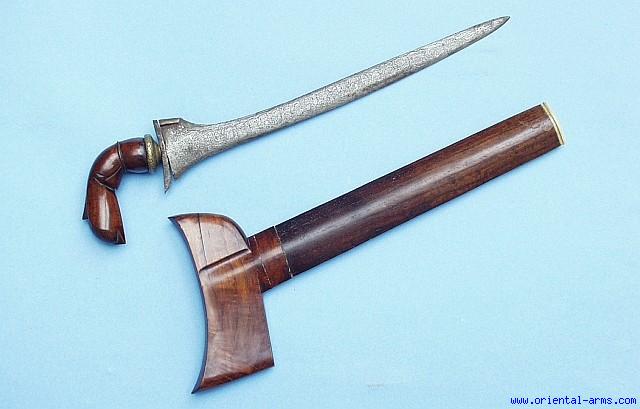This Bugis Keris Dagger has a very old straight blade 13 inches long, with clear pamor structure. The mendak is engraved brass. The hilt and scabbard are carved in a classical Sulawezi style. Scabbard tip is mde if a piece of ivory. All part original. The ganja is slightly loose but otherwise in very good condition Very reasonable price for the quality. |