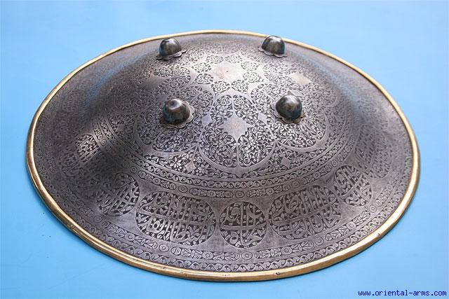 This heavy Indo - Persian shield is late 18-early 19 C., steel, decorated with fine chiseling of floral design and inscriptions in Arabic letters and traces of gold koftgari decoration. Diameter 18 inches with brass rim around. Very good condition. The inner fabric cover, hand cushion and handles are missing. |