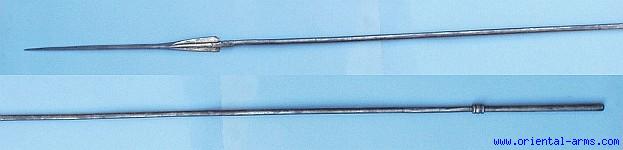 I am not sure about the origin of this spear but I think it is Indian. 74 inches long whole still construction and a deadly 14 inches head with acute tip. The steel shaft is decorated with a simple spiral engraving. Very good condition and attractive price for this unusual piece. |