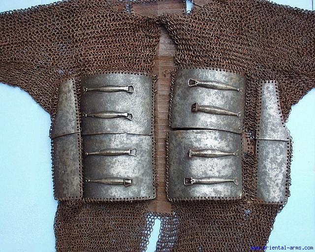 Mail armor is one of the oldest forms of armor and was made by almost all nations and used by almost all warriors from oldest times. It is composed of interlacing links (rings) of steel forming a flexible and relatively lightweight armor. This mail shirt is Indian, from the 17th century and coming most probably from the armory of the Maharaja of Bikaner. It is composed of many thousands of separate rings each one interlaced with four other rings and each one individually riveted (see detailed Photo). This is the most authentic and strongest form of mail armor, in contrary to the later ones with open rings or coiled rings like in key holders. The shirt is 57 inches wide (tip to tip of sleeves fully stretched) and 32 inches long. It has two chest plates with two buckles in each plate, and five rows of scales on the back. Very good condition considering its age. Very few rings are missing and there are some darkened areas on the plates but very little pitting. IT IS VERY SELDOM THAT YOU SEE SUCH A RARE AND COMPLETE ITEM ON THE AUCTION. This is very precious and interesting addition to any Indian arm collection.