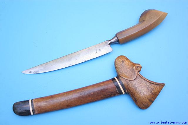 The Siraui is a very rare dagger from Sumatra, with a heavy short and curved blade sharpened on its convex edge. The blade is 7 ½ inches long. The handle is horn of nice light honey color and reminds a Keris hilt. The scabbard also resembles a Keris scabbard. It is wood with horn tip and ivory separators. Total length 14 inches. Very good condition. |
