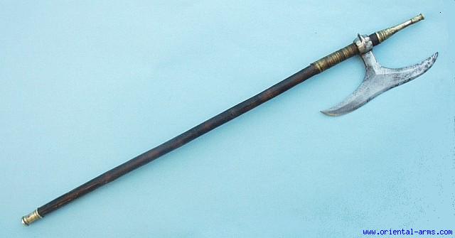 The BULLOVA is the traditional fighting axe of the Chota Nagpur aboriginal tribes of central India. The blade is made of hand forged and polished steel and it is 11 inches tip to tip. It is mounted on a dark wood shaft through its heavy socket, secured in place by brass wire bound on the haft just below the head. The base and the top of the wood haft are fitted with decorated bronze fittings. Very good condition, attractive price. |