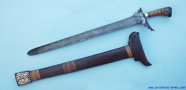 This is a very good Moro Kris sword, probably 19 century. The straight heavy blade is 22 1/2 inches long, constructed from a pattern welded (Damascus) steel. The grip is horn bound with rattan fibers. The scabbard is dark wood bound with rattan strips in three bands. The tip of the scabbard is carved in floral pattern and filled with white material. Good condition. Minor damages from battle scars on the blade. The grip is later to the blade and scabbard. The metal clamps are missing and the rattan wrap is recent. Yet it is a great item altogether. An excellent sword and one of quality for any collection of Filipino weapons. |
