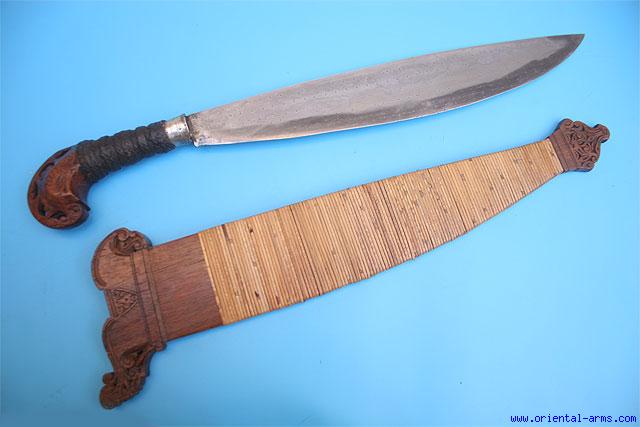 This Barong sword was donated to the John Woodman Higgins Armory Museum, Worcester, Massachusetts, on May 9, 1957 by Nathaniel Sage, Jr. and William H. Sage III, grandsons of Brigadier General William Hamden Sage (1859-1922.) General Sage had a long and successful military career in Mindanao, Jolo and Malsbang in the Philippines 1898–1906. This Barong has a 15 inches blade forged from good laminated steel with heat hardened edge. The right face of the blade is decorated with array of punched dots. Very fine hardwood handle with carved and pierced pommel and grip bound with braided fibers. Wood scabbard partially bound with rattan strips. Total length 24 inches. Very good condition. |