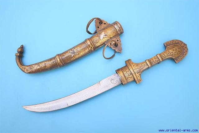 Up for sale is this good Moroccan dagger, from South Morocco. Classical Koumaya style with curved blade 9 ½ inches long stamped with an image of a human face. Finely chased brass scabbard and handle with thin star shaped silver decoration. Big side ears and steel rings for baldric suspension. Total length 15 ½ inches. Very good condition. Small dents on the bras and on the scabbard tip. |