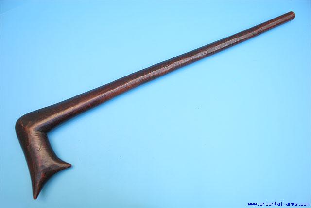 We are not sure as to the origin of this club. May be Africa but could be elsewhere. Very well made from grained dark hardwood. 7 inches wide 29 inches long. Very good condition. Good shining age patina.