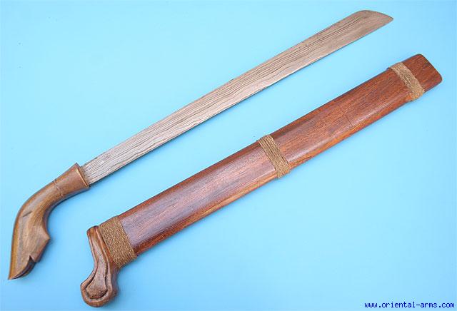 A classical Parang sword from Java, Indonesia, with an 19 inches long very well forged pamor blade. Horn handle. Wood Scabbard. Total length 26 inches. Very good condition.