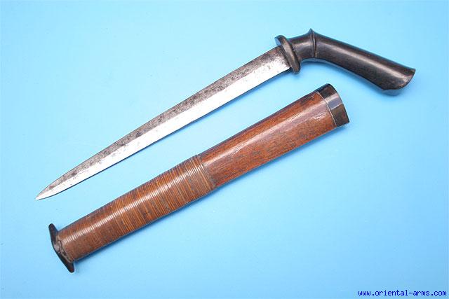 The Badek (or Badik) is a knife / dagger from Java, Indonesia. It is characterized by its pistol grip shape handle. This one has an unusual dagger style double edge blade 9 inches long. Polished black horn handle. Wood scabbard with horn mouth partially bound with rattan fibers. Total length (in scabbard) 13 inches. Very good condition. |