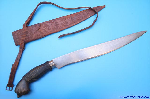 Very Good Classical Bolo Sword from the Philippines: Heavy blade 13 ½ inches long with beveled edge. Black horn grip with palm shaped pommel. Tooled leather scabbard. Total length (in scabbard) 21 inches. Very good condition. Some grinding signs on the blade. Minor bug bites on the horn handle |