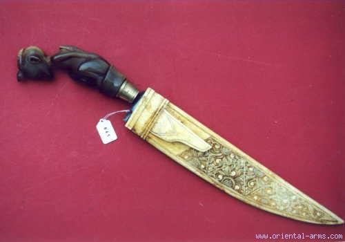 A small knife from the Philippines. The blade is 9” straight, heavy and single edge with a short 3” false edge – quite a common utility side knife in the Philippines. Unusual are the scabbard, made from bone and carved in a very intricate design and the hilt which is carved from a solid piece of horn in the shape of a seating monkey, a snake wrapped around it with its head at the monkey back and a turtle seating on the monkey head.