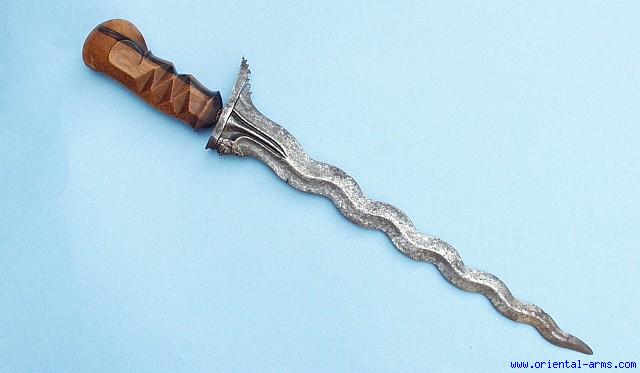 A very good keris Dagger from Bali. Wavy blade 16 ½ inches long with excellent pamor pattern and a beautifully chiseled monster head at the top. Wide Ganja, almost 4 inches wide. Wood grip without mendak. No scabbard. Very good condition. Few nicks on the edges and a minor pitted spot. The wood grip may be a little bit later to the blade. A very rare and unusual Keris. |