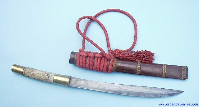 This is a very good old Dah Dagger / Knife, most probably Burmese, 19 Century. The blade is made from very good high carbon steel with a clear hardened edge. It is single edge, 11 inches long, with 3 inches slightly clipped tip. The handle is wood covered with sting ray skin and fitted with brass fittings. Wood scabbard bound with braided rattan strips and original red baldric rope. 18 inches total length in scabbard. Very good condition. All parts original no replacements or restoration.