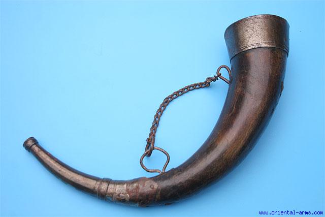 Up for sale is this powder horn, Moroccan, late 19 to early 20 C. Based on a cow horn with steel mounts. Length 12 inches. Very good condition.