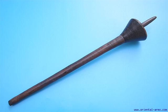 This club comes probably from east Africa, may be Uganda. Africa but could be elsewhere. Very well made from one piece of hardwood, with a conical head hardwood 3 inches long ending with a 3 ½ inches wood spike. Total length wide 24 inches. Very good condition. Good shining age patina. |