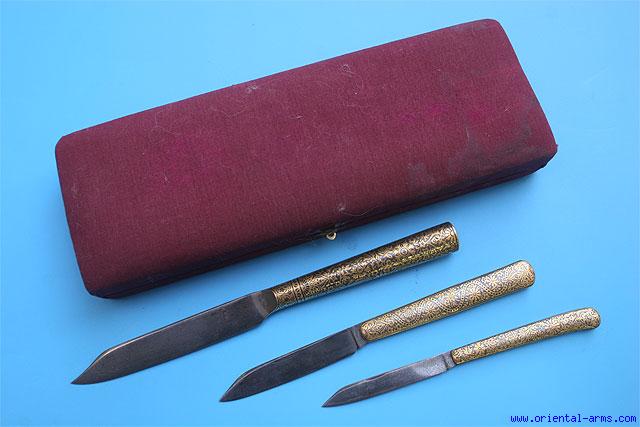 This very fine set of knives is India, late 18 – early 19 C. Its comprises of one kard knife and two folders. All with very fine, dark, high contrast wootz (Damascus, watered) steel blades and steel handles richly decorated with gold inlay work in a very fine floral pattern. This set comes with its original box, with recesses for each knife and dark red velvet cover. Box length is 11 ½ inches. Very good plus condition. A very fine and impressive set. |