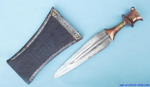 We offer here for sale a rare find, a complete sword, probably of the Konda tribe from Zaire, with its original scabbard. The blade, in very good condition is 12 inches long with central rib and side fullers. The grip is wood covered with copper sheet and bound with brass strips. The pommel is also entirely covered with copper but slightly damaged at the sides. The scabbard is wood lined with heavy leather and fitted with steel reinforcement strips on the side and top. All in very good condition except the damage to the pommel covering. |