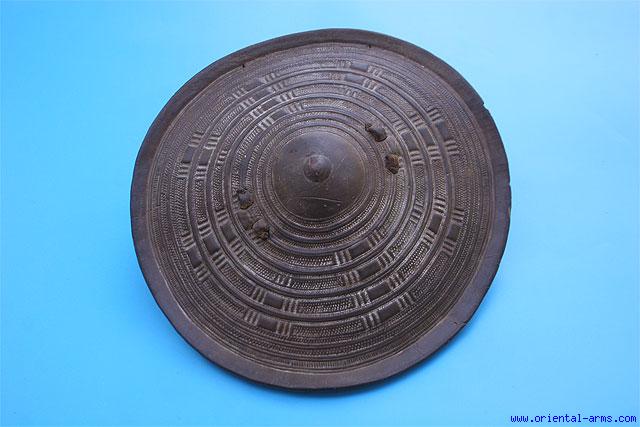 We offer here for sale a early 20 Century war shield from Somalia. It is 12 1/2 inches in diameter and made from heavy Buffalo (?) hide, very nicely tooled with design of circles around its center. Very good condition. Good age patina on the hide. Minor distortion due to shrink of the hide. |