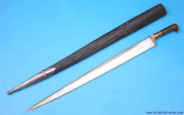 This is a classical example of the famous Khyber sword coming from Afghanistan. The heavy massive blade is 25 inches long, 2 inches wide with a pronounced T spine. The bolsters and grips straps are brass with red painted engraving. The grips are ribbed horn with good age patina, Original scabbard covered with tooled leather and a steel chape. Total length 34 inches. Very good plus condition. A fine and impressive sword. All parts original without repaired or replaced parts. |
