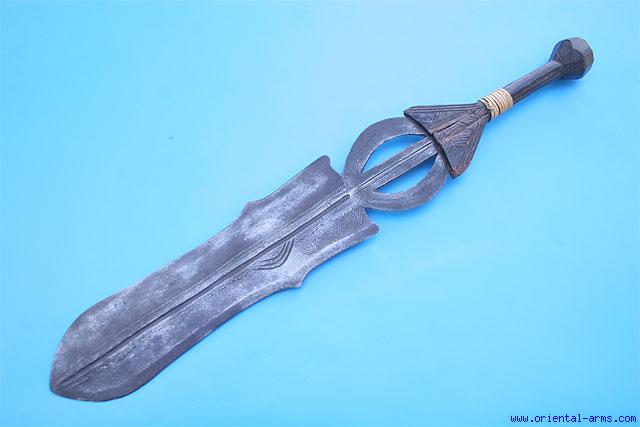 Up for sale is this good war sword of the Ngombe people from Zaire. Typical 16 ½ inches blade with rear “ears” decorated with geometrical design. Wood handle. Total 24 inches. Very good condition. Old age black patina. Later band of rattan strips on the handle. |