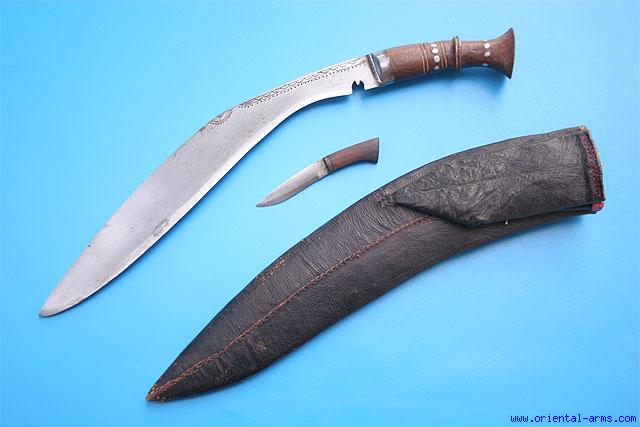 Up for sale is this good Khukuri knife, Nepal, first half of the 20C. 1940 or around. Swollen blade nicely engraved, 12 inches long, with ridged spine and steel bolsters. Hardwood handle with small Aluminum inserts. Original scabbard covered with black leather. Back pocket for accompanied knives including a knife (Karda), and a leather flint pocket. Total length 18inches. Very good condition. Very low price. |
