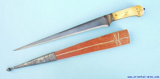 This superb dagger is a rare style of something between a Karud , the straight back member of the family of the Pesh-Kabz, and a Khybar Knife. The whole family of such daggers is common to India, Persia and several Central Asian countries. The blade is of forged Indian wootz (crystalline), 12 inches long, heavy, with a pronounced T spine tapering to an acute tip. The grips are of elephant ivory, the grip strap and bolsters are steel with delicate koftgari gold decoration. Wood scabbard with red velvet cover and steel tip. Very good condition. Excellent blade shape and very good age patina to the grips. Considerable part of the gold koftgari on the grip strap is already erased. The steel tip of the scabbard is slightly damaged. It is a later addition and probably comong from another Central Asian dagger. Good investment in a rare item for the advanced collector of Asian blades. |