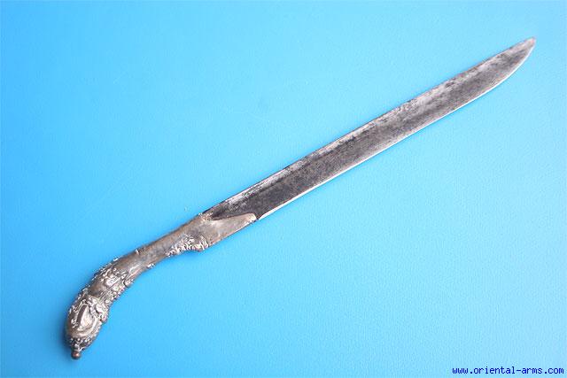 Up for sale is this good and unusual “PIHA KAHETTA”, the traditional knife of the Sinhalese from Sri-Lanka (Ceylon). The 8 inches blade with the straight spine is typical to these knives from the 19C. The silver handle is quite scarce and unusual. Total length 11 inches. Very good condition. No scabbard. Very low price. |