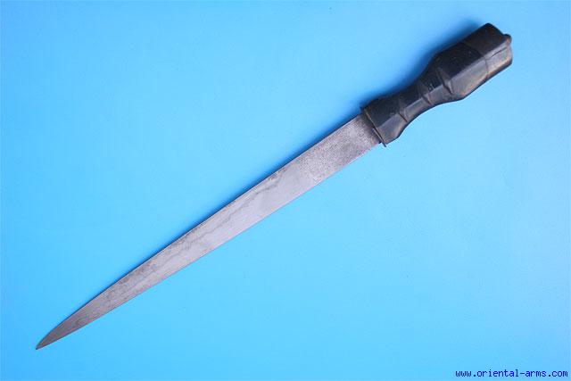 Up for sale is this dagger, Tibet, late 19 C. Massive blade with beveled edge, of triangular cross section 12 ½ inches long. Black horn handle with steel mounts and small steel cross guard. Total length 16 ½ inches. Very good condition. Age cracks on the handle but it is very solid. No scabbard. |