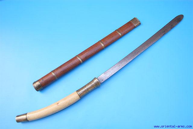 This Short dah sword is probably Burmese (or may be Thai), late 19 – early 20 C. The blade is 16 ½ inches long with rounded tip. The two handed grip is massive bone with brass mounts. Wood scabbard with brass bands. Total length 27 ½ inches. Very good condition.