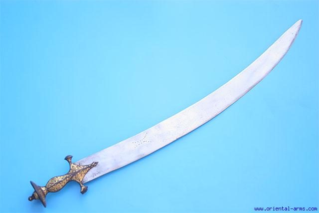 Tegha is a common name for the Indian swords with wide blade. This one is probably late 19 C. with a blade 26 inches long, 2 inches wide with a styled “eye lashes” mark. Classical Tulwar style handle with gold koftgari work. Total length 30 inches. Very good condition. Losses to the gold work.