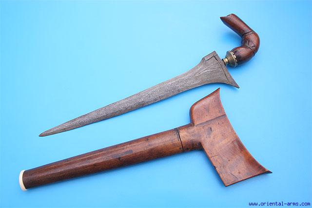 This very good Bugis Keris Dagger has a massive 14 inches straight but very slightly curved blade with clear pamor structure. The mendak is brass. The hilt and the scabbard are carved from a grained wood. Ivory scabbard tip. Total Length 18 inches. Very good condition. |
