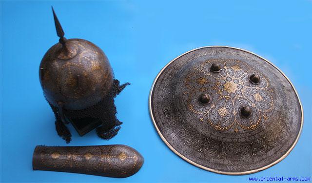 This very fine set of armor is Persian Qajar, mid 19 C. It comprises of a shield (Dahl) an helmet (Kula Kud) and a hand armor (Bazu Band). All made of steel, finely chiseled and decorated with gold and silver koftgari work. Shield 18 inches wide, helmet 7 ½, Bazu Band 12 invches long. Very good condition. Losses to the silver koftgari work. Back fabrics cover and handle are missing. Very impressive and decorative set. |