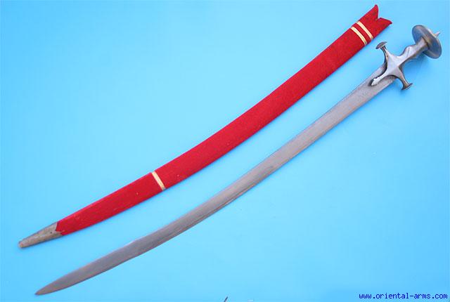 This long fighting Tulwar is early – mid 19 C., most probably coming from the Bikaner armory, Rajasthan, India. The all wootz blade is 33 inches long, marked with punched dot markings on both faces of the blade. Large size steel handle with big disk pommel. Newly made scabbard with velvet cover. Total length 40 inches. Very good condition. The punched dot marking as well as the clean lines and size of the handle suggests the attribution to the Bikaner armory. |