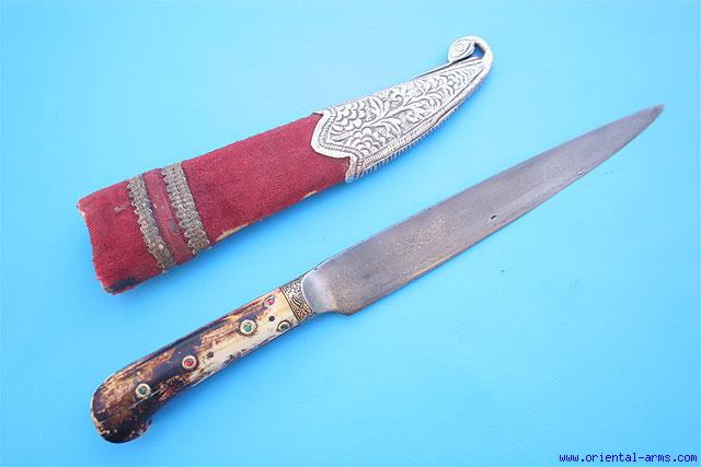 This Kard knife is Indian, late 18 – early 19 C. Finely forged wootz (Watered, Damascus) steel. Ivory grips with flared pommels set with colored stones in gold setting. Steel bolsters and grip strap with gold koftgari decoration. Velvet covered scabbard with big chased silver chape. Blade 7 inches. Total length 11 ½ inches. Very good condition. Small areas of forging flaws on the blade. |