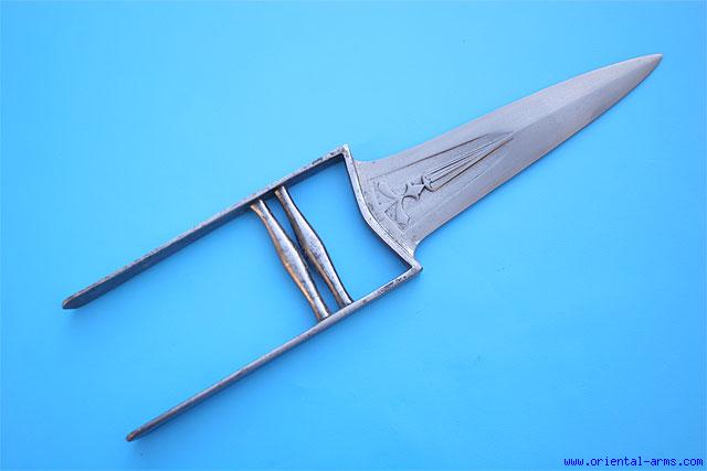 This Kattar push dagger is Indian , probably north India, mid – late 19 C. Massive blade 18 inches long, forged from good Indian Wootz steel. 7 inches long side bars. Very good condition. Very reasonable price.