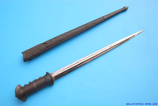 This dagger is French made, 1860-1870, Viollet le Luc style and period, in the style of an early Turkish court dagger. Very good steel blade of diamond cross section. Very fine and precise cast iron handle and scabbard with red stones set around the grip (two missing). Blade 12 ½ inches, total 19 inches. Very good condition. Very interesting dagger. |