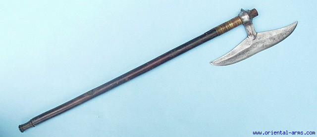 The BULLOVA is the traditional fighting axe of the Chota Nagpur aboriginal tribes of central India. The blade is made of hand forged and polished steel and it is 11 inches tip to tip. It is mounted on a dark wood shaft through its heavy socket, secured in place by brass wire bound on the haft just below the head. The base of the wood haft are fitted with decorated bronze fittings. Good condition, attractive price. |