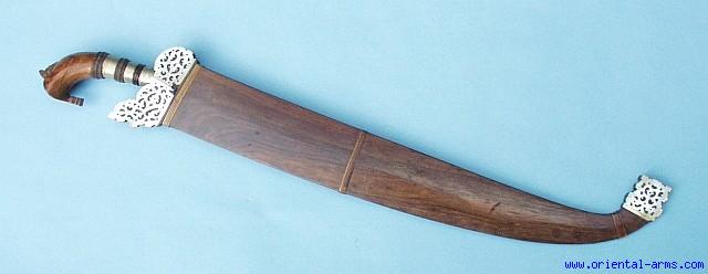 We offer here for sale a Barongs sword with heavy leaf shaped blade, known to have superior cutting abilities. It is a good Moro Barong, from early 20 C. with a 19 inches blade, (longer than the usual 14 inches blades). And with a swollen cross section. The hilt is carved from a beautiful grained wood in a very classical form, with a long Nickel/Silver collar and three braided rattan bands. The scabbard is wood bound with three Rattan bands. The head and the tip of the scabbard are set with a beautifully pierced and engraved plates of Mother of Pearl (MOP). Very good plus condition. Minor areas of pitting on the blade and a small part of the MOP plate is missing. Altogether a very impressive piece of weaponry. |