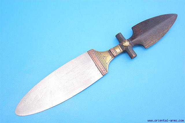 This fine item is probably a ceremonial knife / Dagger from West Africa, mid 20 C. The spatula shape blade is of very good steel, 6 ½ inches long almost 2 inches wide. Brass / copper bolster and a cross shaped handle with a large leaf shaped wood pommel. All very well made and of highest workmanship. Total length 9 ½ inches. Very good condition. No scabbard. |