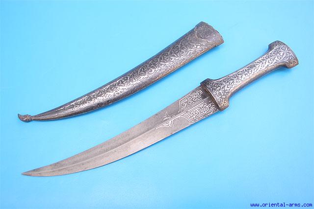 This Jambiya / Khanjar dagger is Persian Qajar period, late 19 C. the blade is curved, double edged with a central rib, 10 inches long. The top of the blade is decorated with silver Koftgari work. The handle and scabbard are whole steel very richly decorated with silver koftgari inlay work. Total length 16 inches. Very good condition. Very minor losses ti the silver inlay.