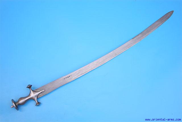 This fighting Tulwar is early – mid 19 C., most probably coming from the Bikaner armory, Rajasthan, India. The laminated blade is 30 inches long with a 10 inches back edge and fullered spine. The blade is marked with Latin letters and punched dot markings on both faces of the blade. Whole e steel handle. Total length 37 inches. Very good condition. This sword comes with a newly made scabbard (not shown). The punched dot marking as well as the clean lines of the handle suggests the attribution to the Bikaner armory. The Latin letters may indicate a European made blade. |