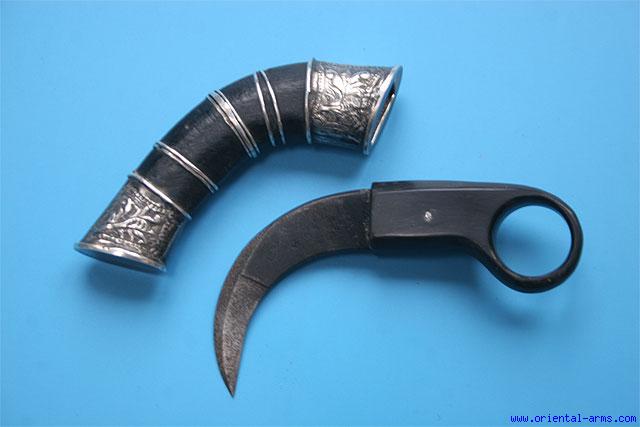 This Korambi curved dagger comes from Sumatra, late 19C. Well forged heavy blade, deeply curved claw shaped with thickened tip 3 inches long. Horn grip with thumb hole.Silver mounted wood scabbard. Total length 6 inches. Very good condition