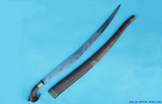 This is a sword from the Philippines probably mid 20th, comprising a long heavy 24 inches curved blade. The hilt however is a classical hilt of a Barong sword. Wood scabbard with brass fittings. Very Good condition, very low price.