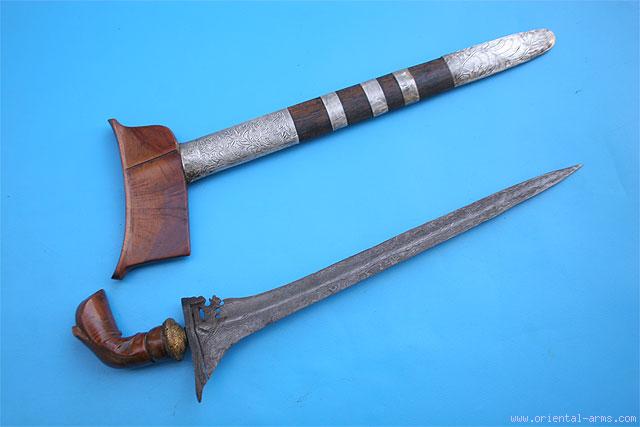 Up for sale is this fine Bugis Keris dagger, Early 20 C., with a finely forged blade, 14 inches long, chiseled with a Lion (?) image at the top. Grained wood classical shape handle with a brass mendak. Wood scabbard with engraved silver bands. Total length 20 inches. Very good condition. Small wood chip on the handle. |