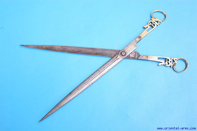 We offer for sale a very unusual item and although not really a weapon, it is usually displayed in the weapons section in private collections as well as in museums. It is a pair of scissors originally used to cut papers in the very well developed calligraphy art of the Persian courts. However its blades are shaped like a dagger and can be used as such if needed. The narrow blades are 7 inches long, hollow ground, with acute point and decorated with gold koftgary work. The handles are brass. Total length 10 inches. Very good condition. |