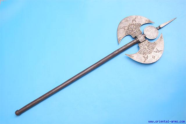 This axe is Persian, from the late Qajar period, second half of the 19 C. Two large semicircular blades, 8 ½ inches tip to tip each, chiseled with decorative inscription in Arabic letters and gold koftgary design in a classical Qajar style, on a common central socket. The blades are mounted on a steel haft etched in a pattern to imitate Damascus steel, and with a 5 ½ inches pike steel tip. Total length 36 inches. Very good condition